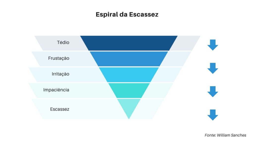 É interessante entender que o que propagamos tem um poder extraordinário. Se alimentamos pensamentos negativos, geramos escassez em todas as áreas da vida. Imagine uma pirâmide, vamos chamar da pirâmide da escassez. Ela possui setas apontando para baixo, que representa o tédio, a frustração, a irritação e a impaciência. Esses elementos geram mais escassez e problemas, criando um ciclo negativo.