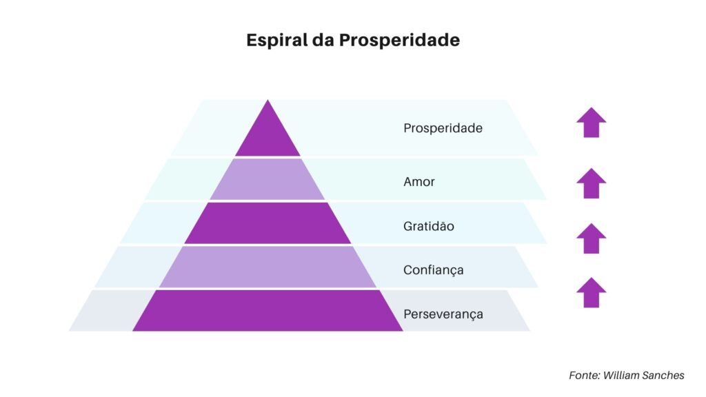 A pirâmide da prosperidade, por outro lado, é representada por setas apontando para cima, com a persistência como a base, seguida pela confiança, gratidão e amor. Trabalhar com esses elementos muda a perspectiva e permite que a vida flua positivamente. A persistência leva à confiança, que por sua vez leva à gratidão, conectando-se finalmente ao amor.